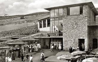 Schon nach kurzer Bauzeit ist es soweit. Die erste Seilbahn wird im Frühjahr 1954 eröffnet – und sogleich zu einem wahren Publikumsmagneten: Man schwebte einfach in 7 Metern Höhe zum Niederwalddenkmal hinauf.